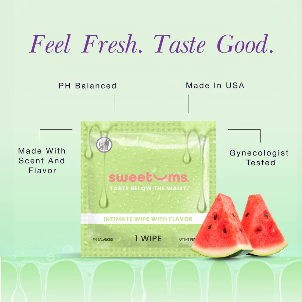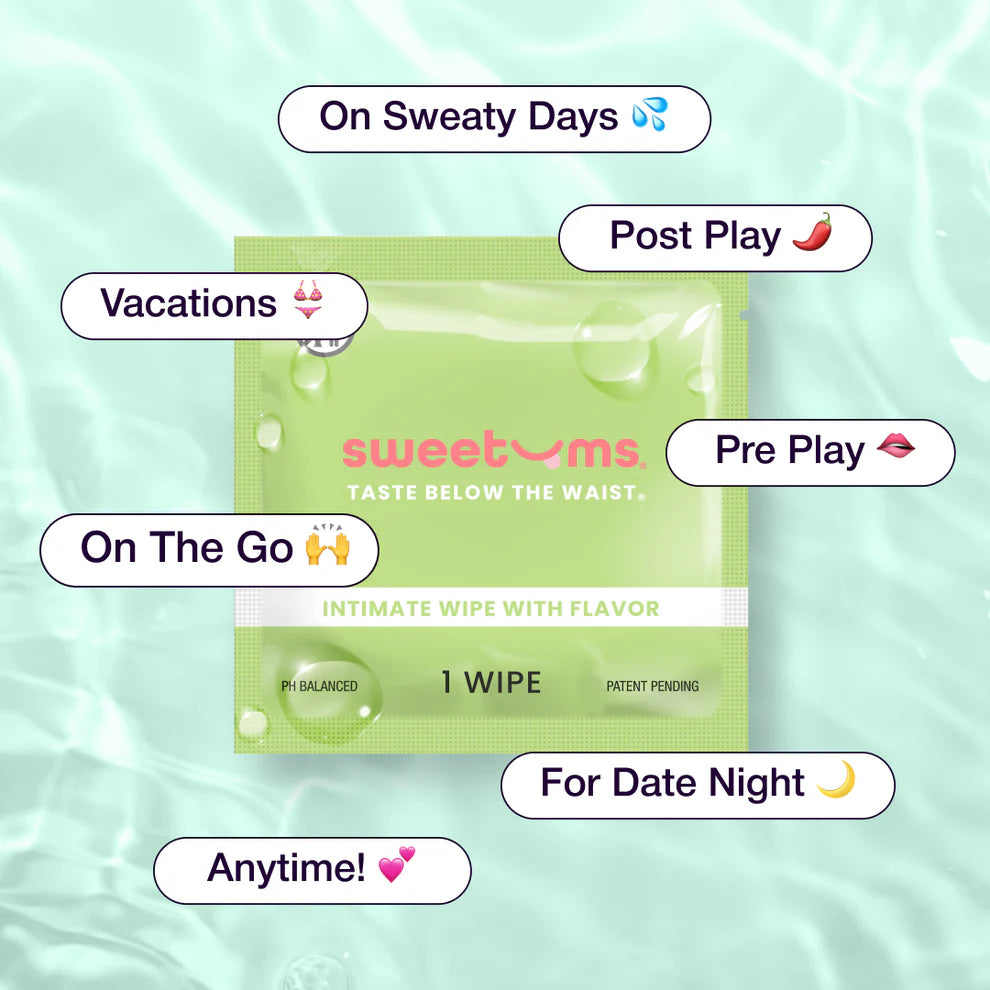 Sweetums wipes are intimate wipes with scent and flavor. Perfect for a quick refresh or spicing things up in the bedroom. Sweetums wipes are pH balanced, non-sticky, and gentle. Made in the USA, each wipe is individually packaged for convenience.